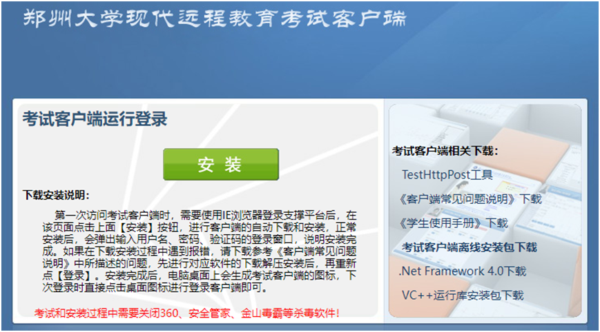 注意事項:操作系統(tǒng)WIN7以上版本,瀏覽器IE8以上版本,關(guān)閉QQ等具有遠程協(xié)助功能的軟件。遇到問題可以在“考試系統(tǒng)客戶端”頁面下載《客戶端常見問題說明》查看解決辦法。