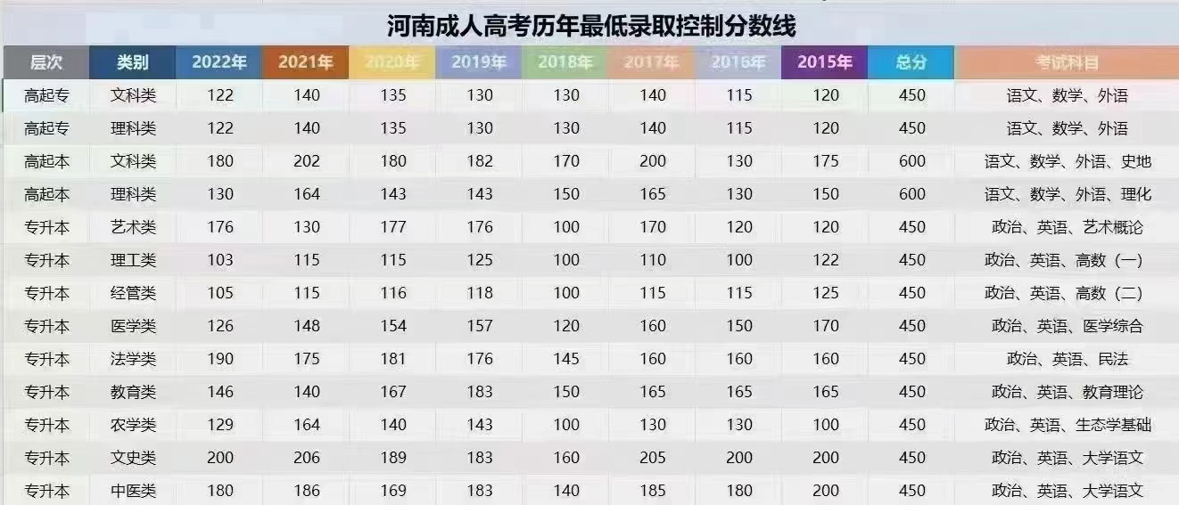 成考每年分數線不同,上下會有些浮動,但是不會超過太多,基本上保持在20分的差距,下面我們匯總了近年來的分數線: