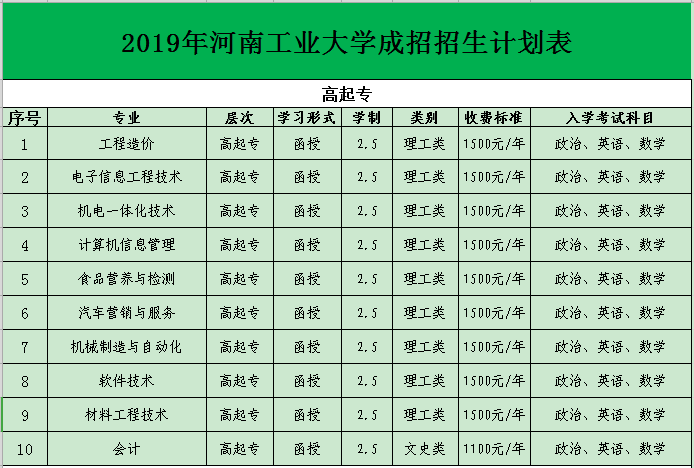 三、2019年河南工業大學成人高等教育招生專業目錄